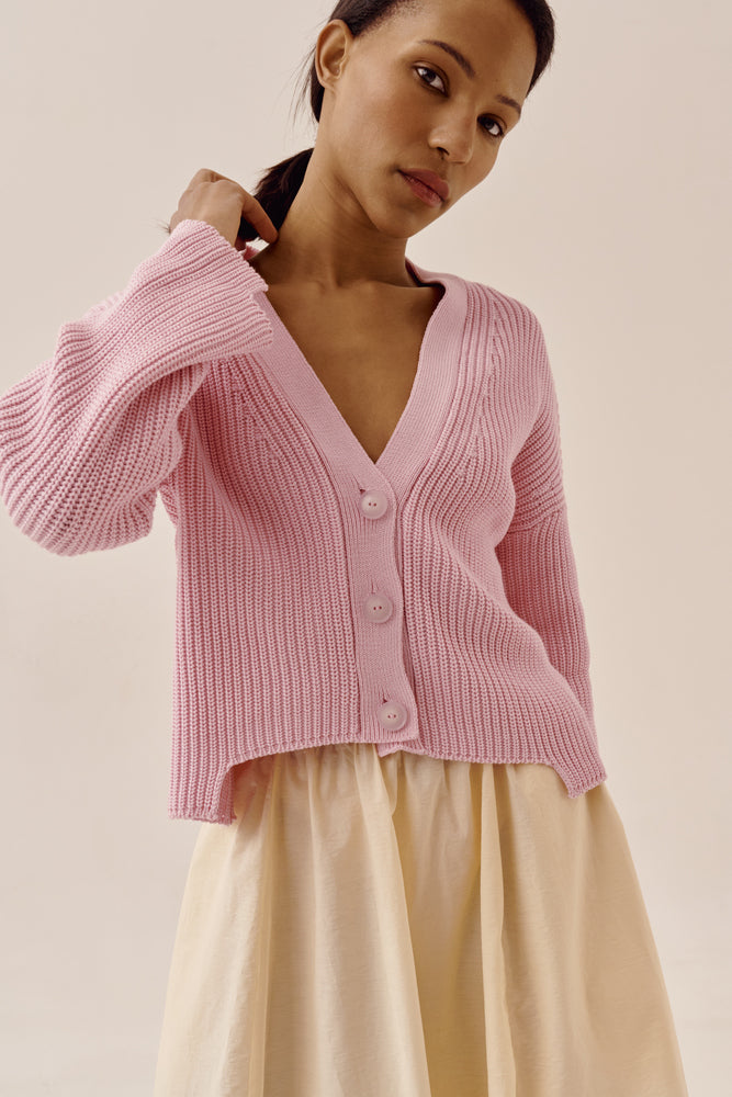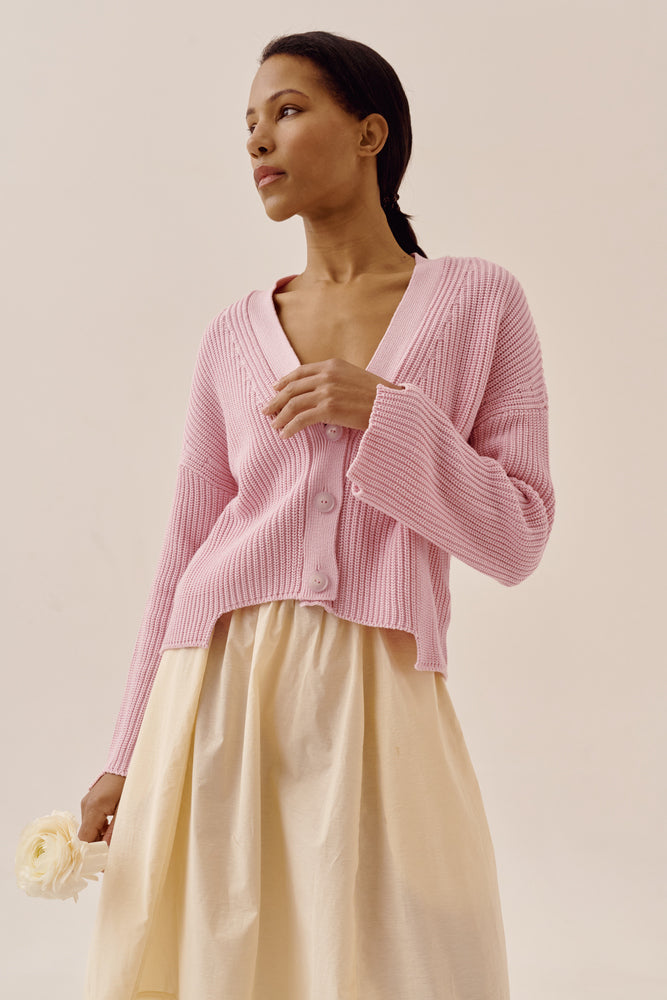 A cropped cardigan made of natural cotton yarn, with a chunky knit and original cutouts on the sleeves and bottom of the cardigan. A cardigan is a thing that is suitable for any season, in the summer it can be thrown over a dress in the evening, in the spring as a separate unit with a top or instead of outerwear.