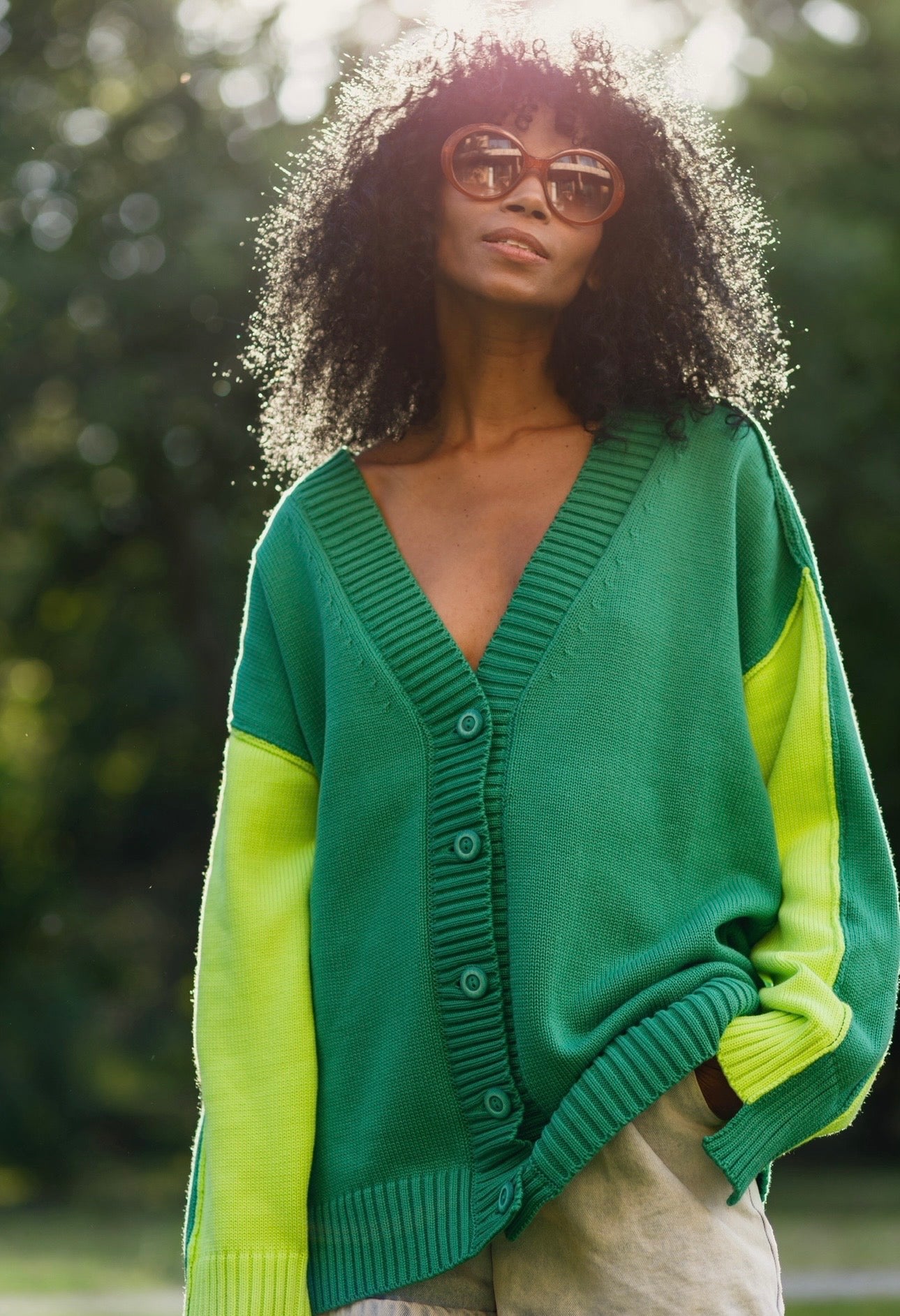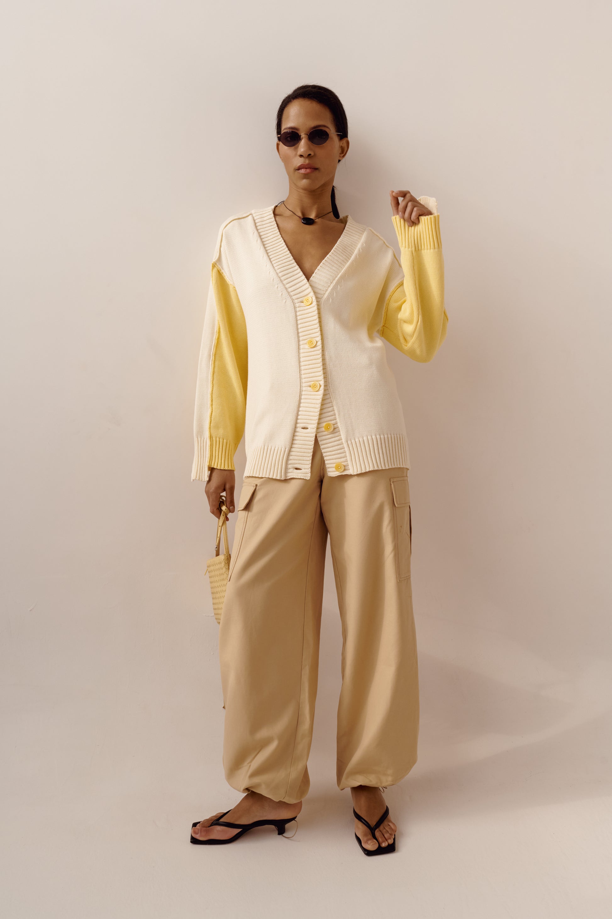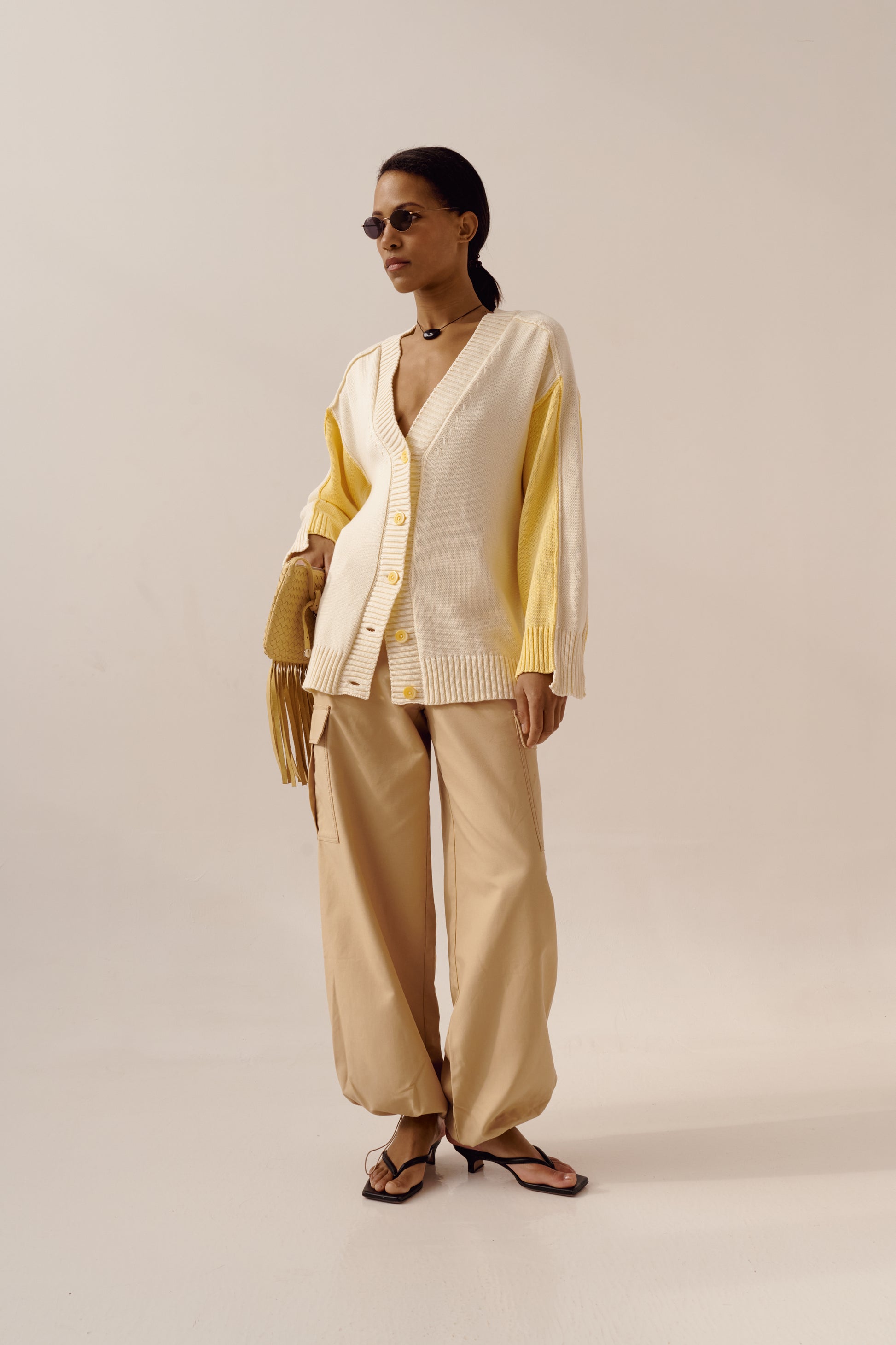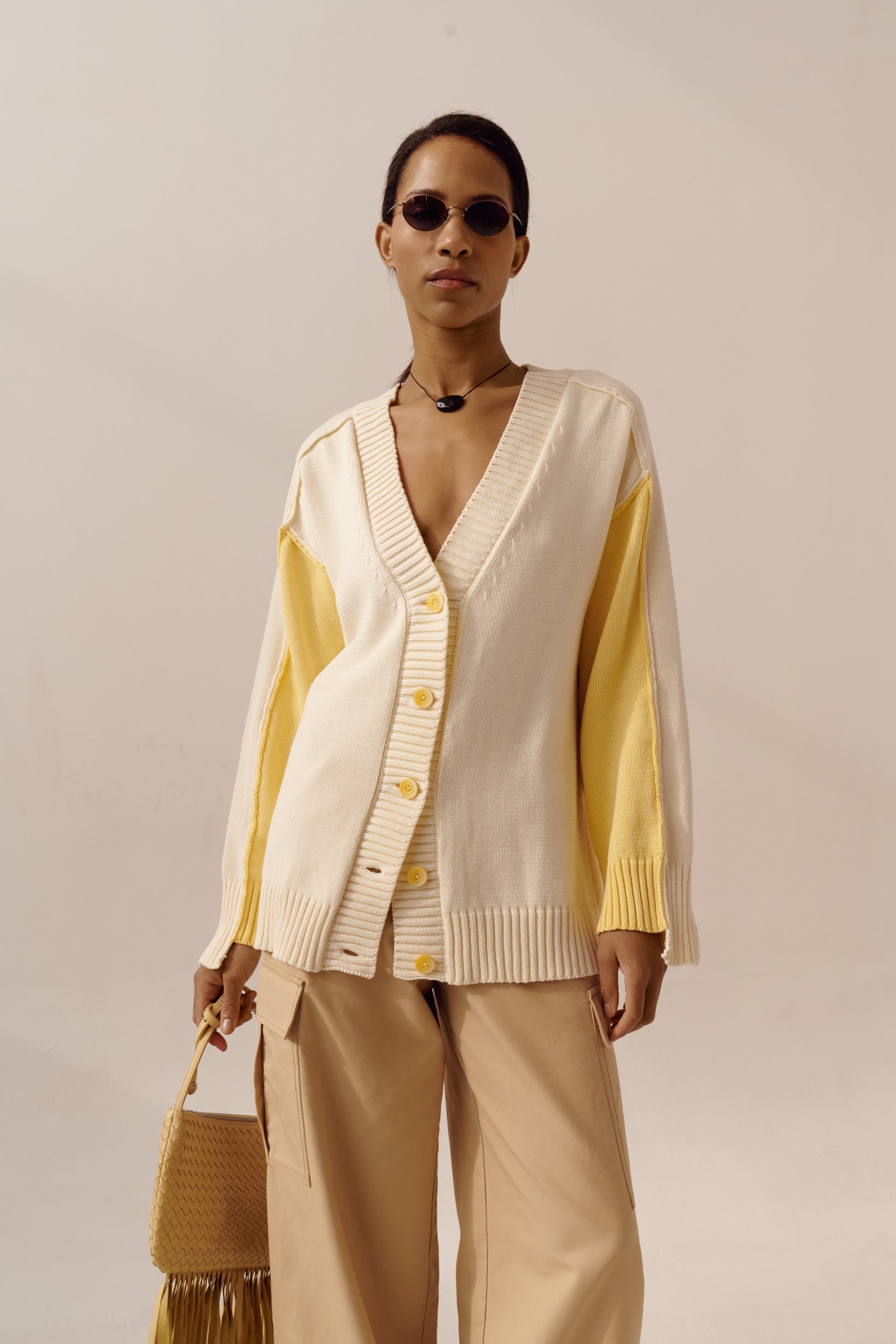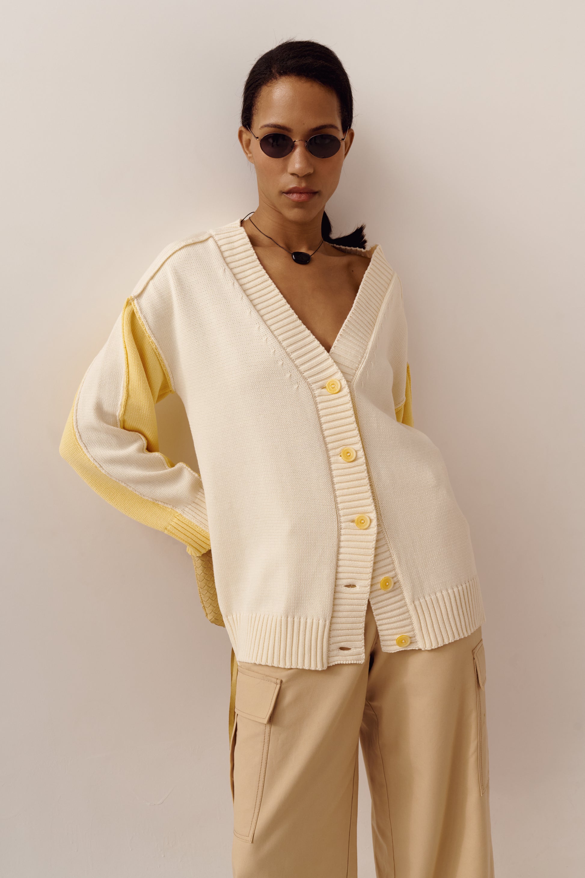Модель з контрастними вставками на рукавах, що додають виробу виразності та характеру. Виготовлений зі 100% бавовни, кардиган приємний до тіла, добре пропускає повітря та забезпечує комфорт протягом усього дня. Натуральна нитка дозволяє шкірі дихати та зберігає форму виробу навіть після багаторазового прання.