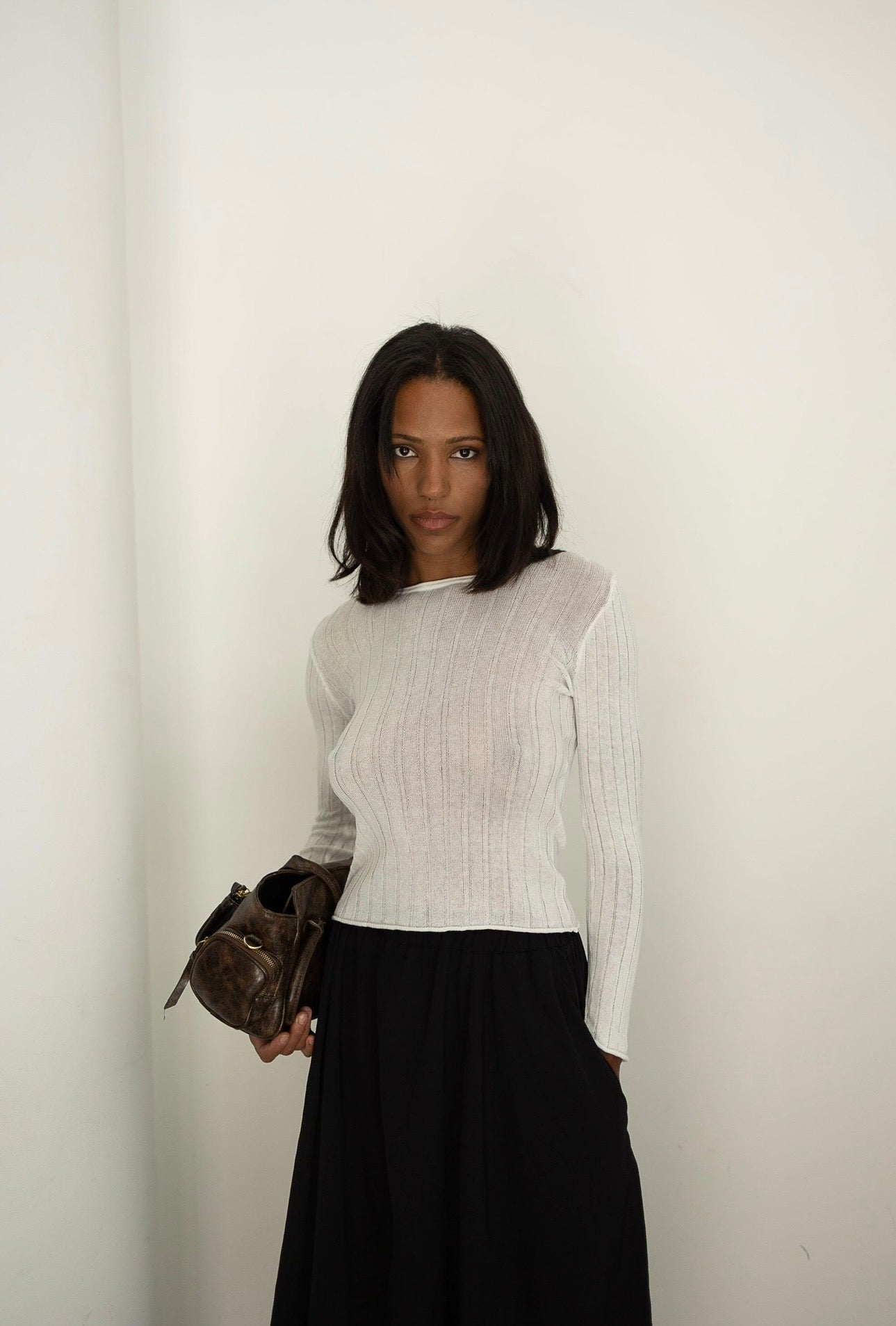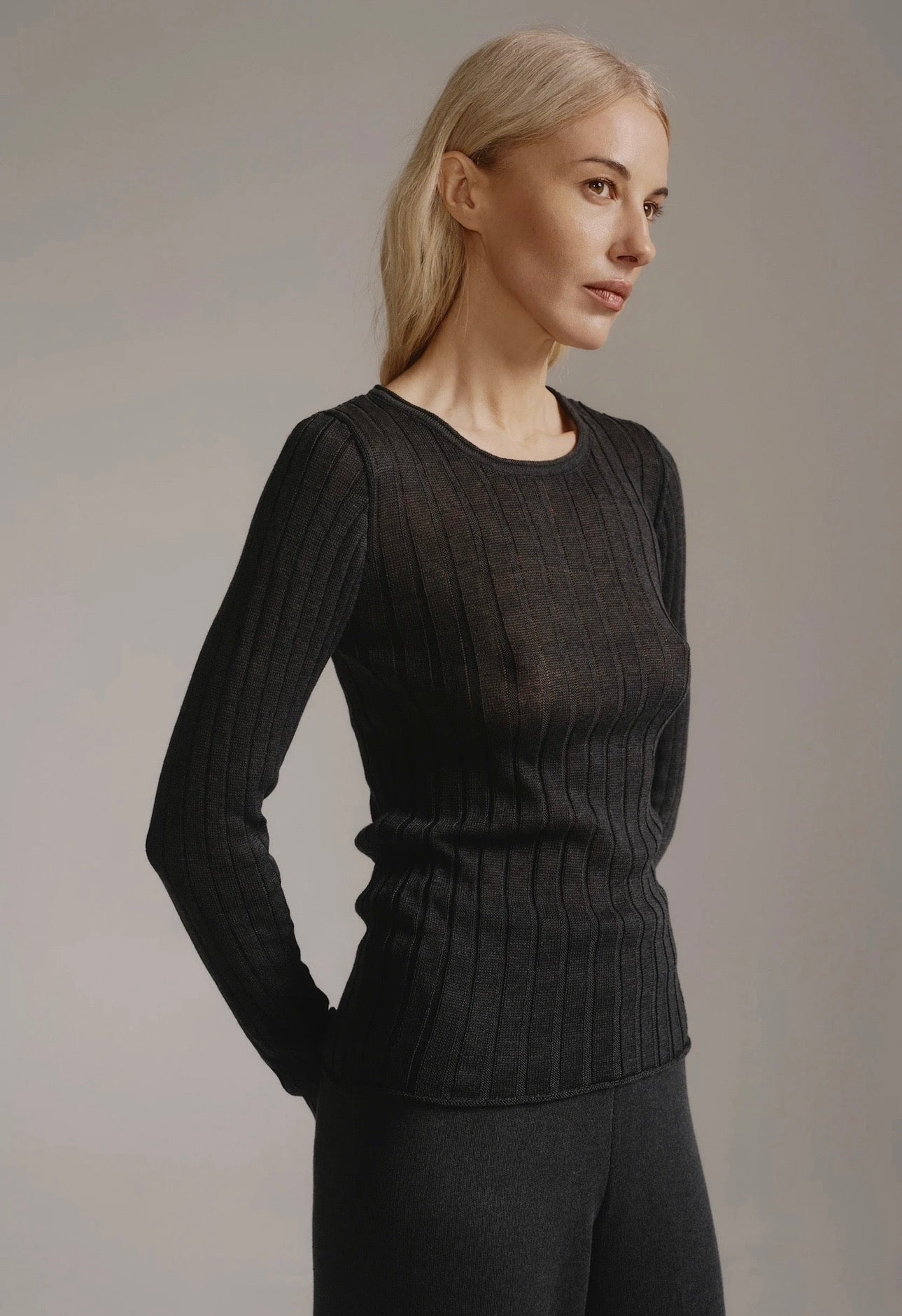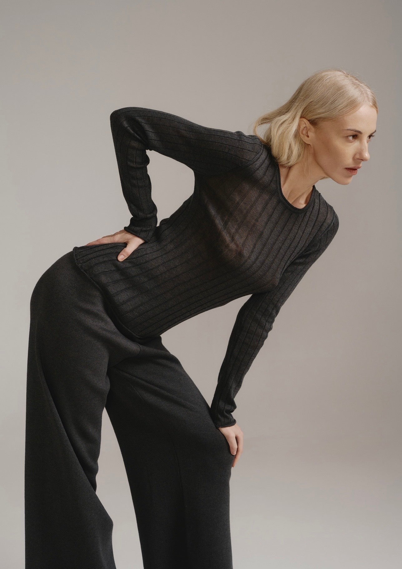 Легкий, делікатний і тактильно приємний лонгслів із тонкої бавовни. Напівпрозора фактура м’яко підкреслює силует, залишаючи відчуття природності та свободи. Вертикальна текстура додає витонченості й візуально витягує лінію тіла.