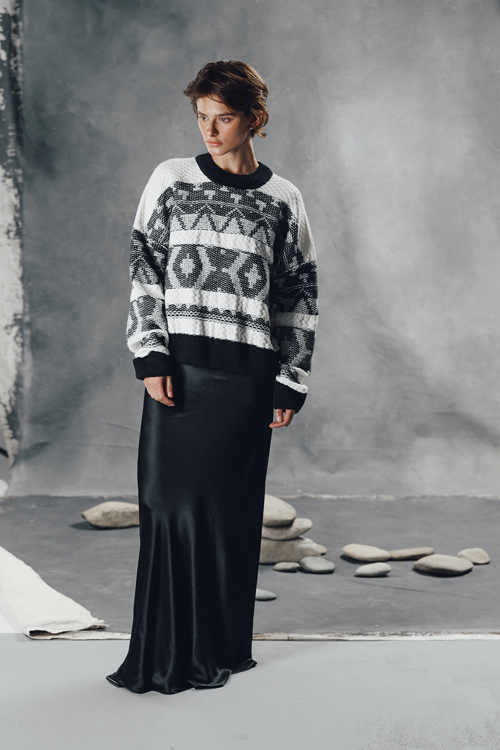 Теплий та затишний світшот із вовни альпаки — ідеальний вибір для прохолодної пори року. Його поверхню прикрашає виразний вінтажний орнамент з геометричними мотивами, що надає виробу характеру та стилю. М’яка текстура натуральної тканини дарує комфорт, а прямий крій забезпечує зручну посадку. Еластичні манжети й горловина додають практичності. Цей світшот вдало поєднує традиційні візерунки з сучасною формою — стане улюбленим елементом базового гардеробу.