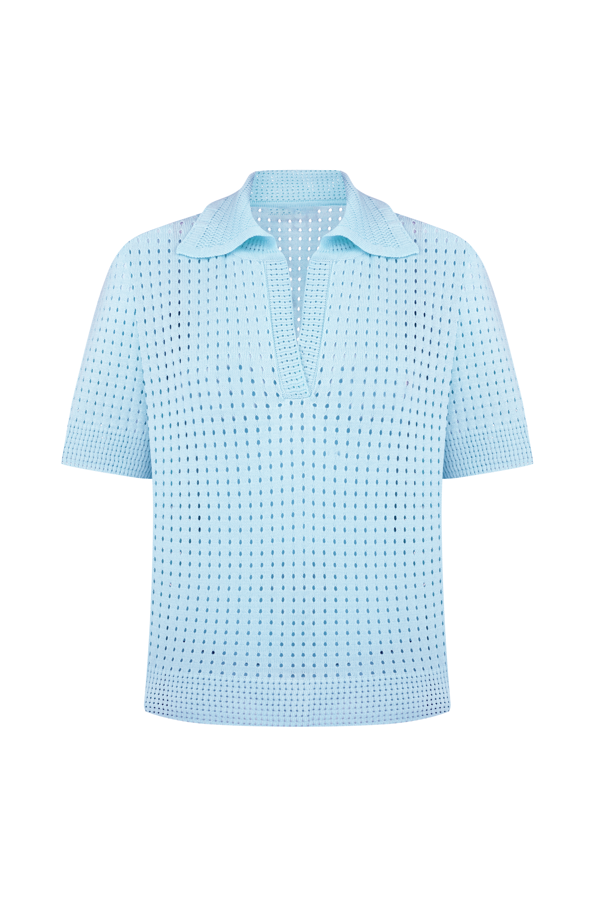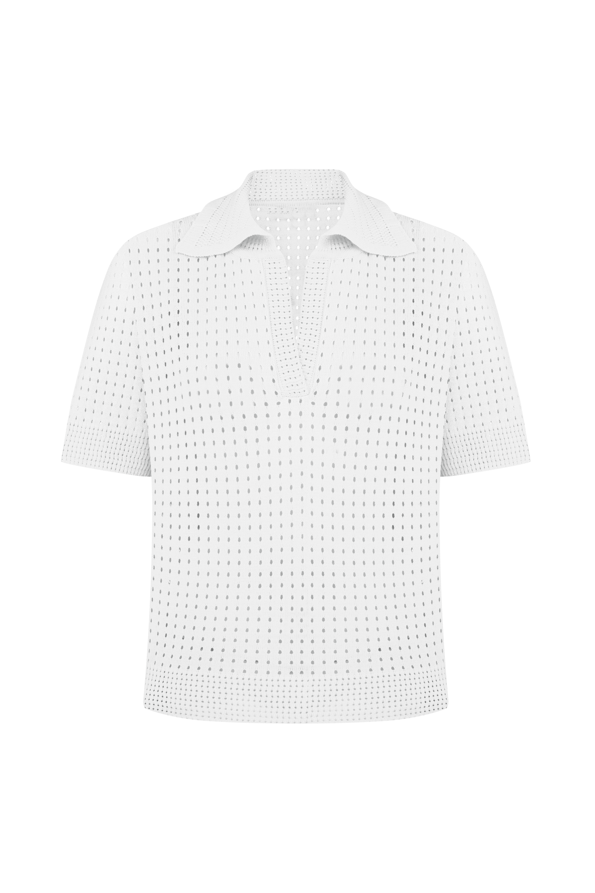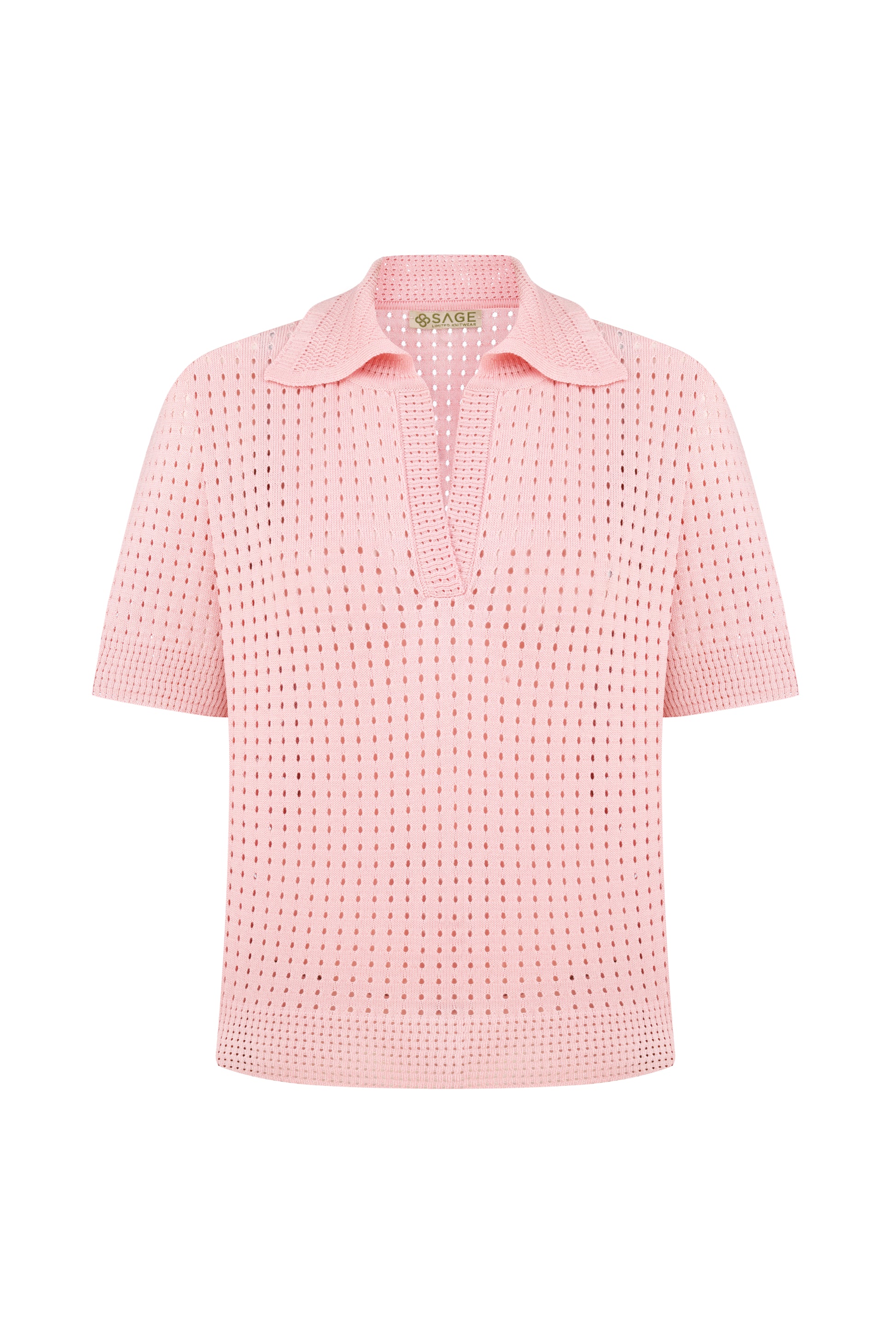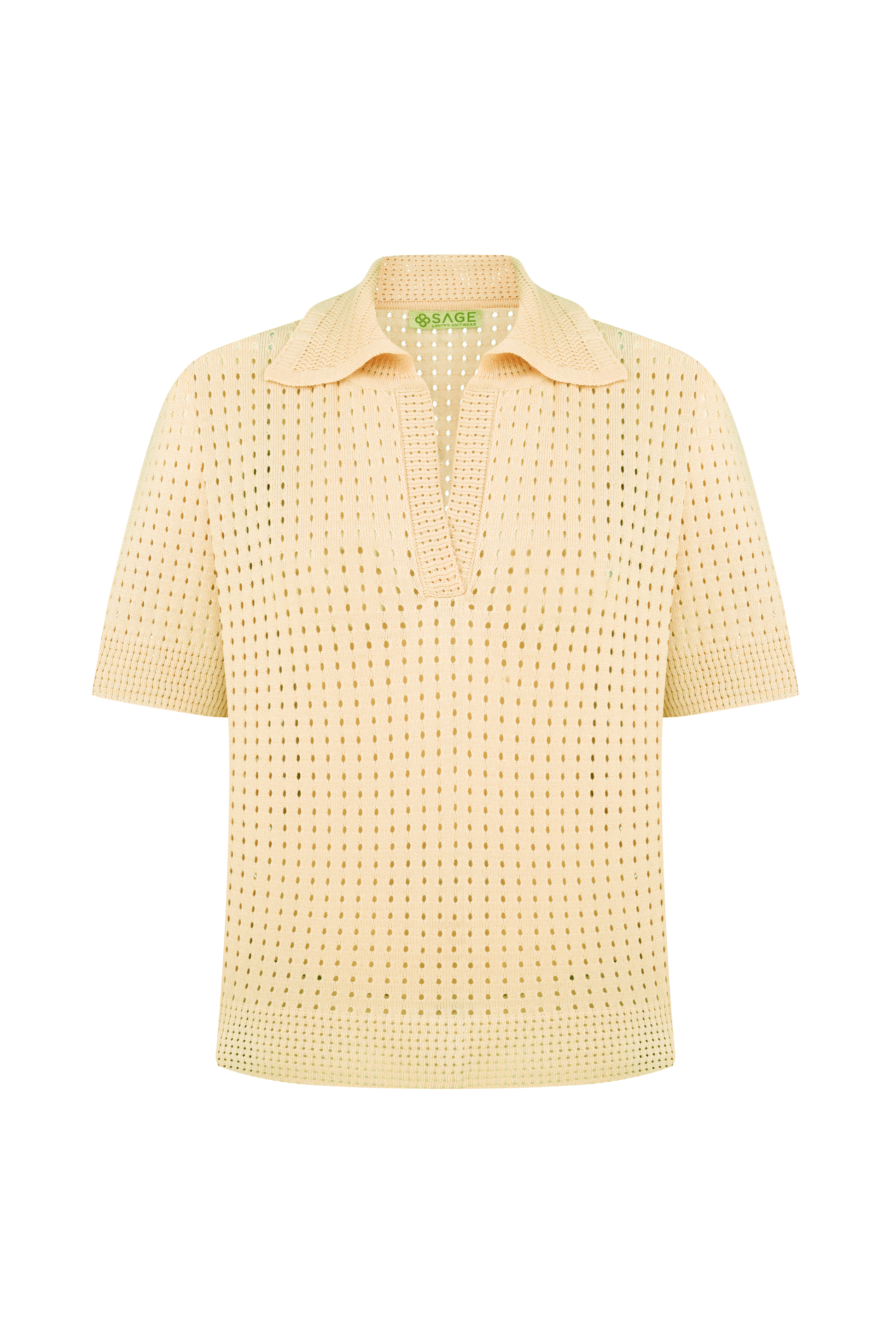Поло в стилі "Кроше" має класичний комір із трикотажним оздобленням та глибокий V-подібний виріз. Тканина виглядає легкою та дихаючою, а завдяки перфорованій фактурі створюється стильний, напівпрозорий ефект. Рукави короткі, а крій трохи вільний, що додає образу невимушеності та комфорту.
