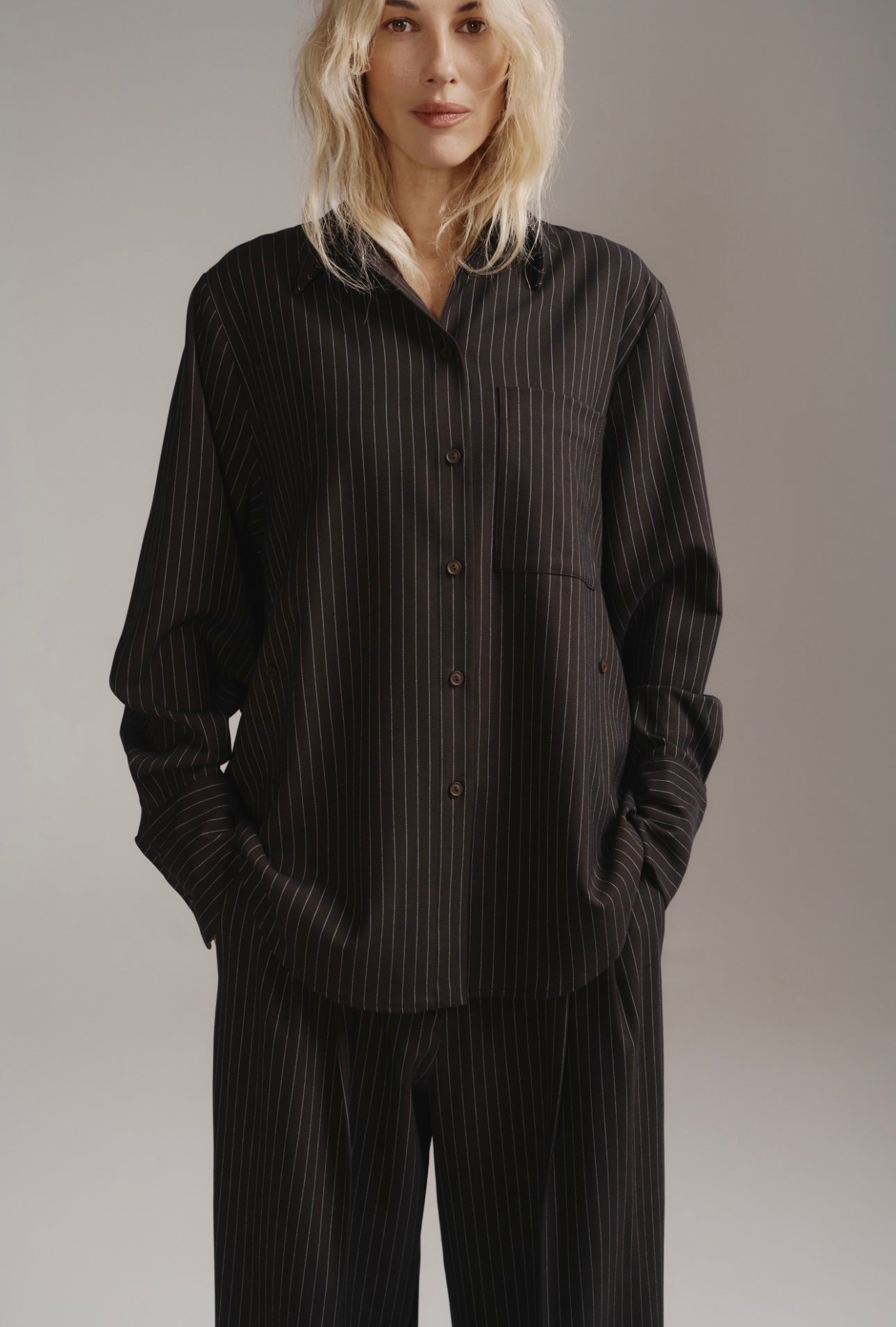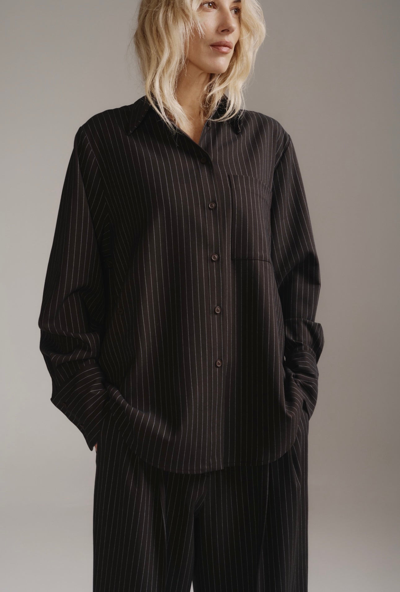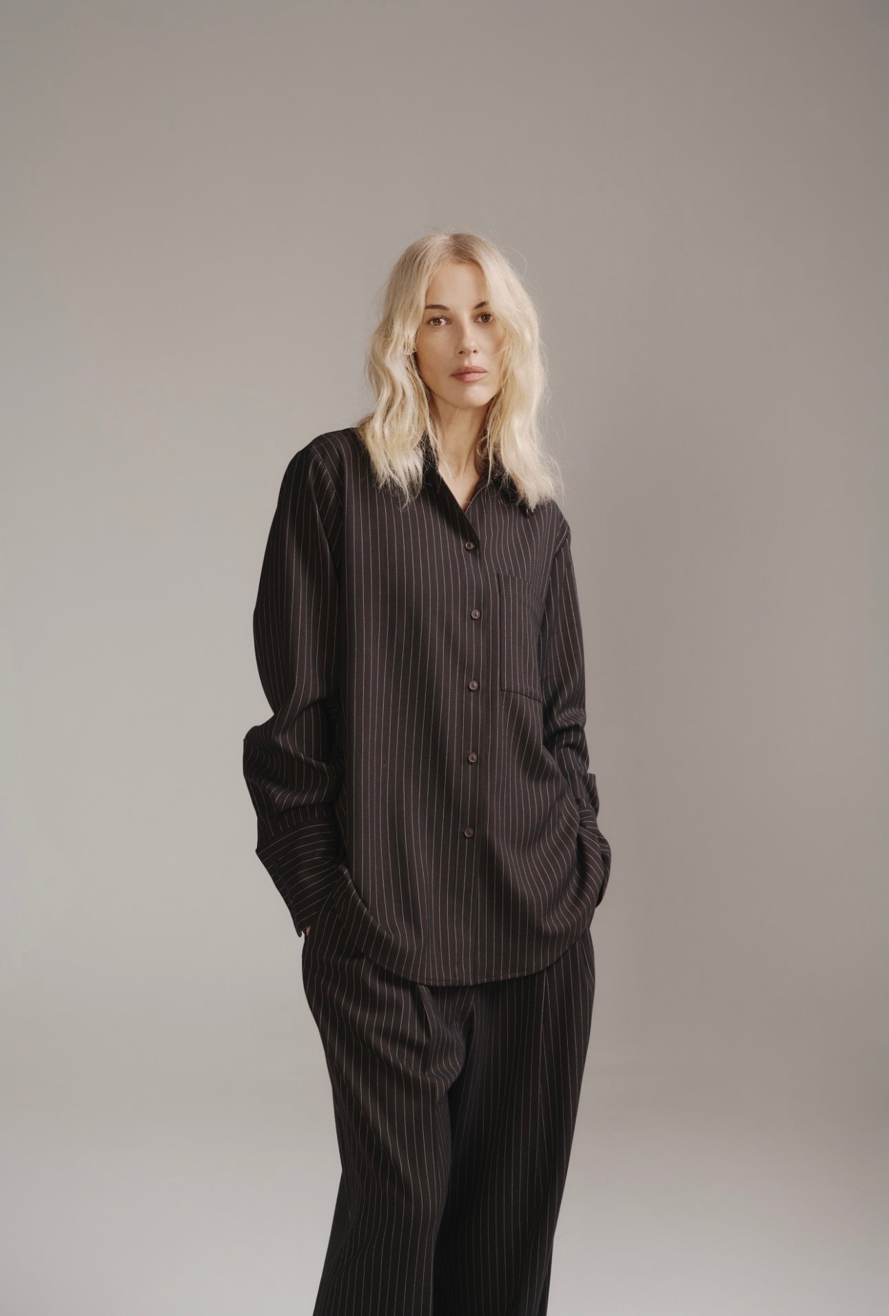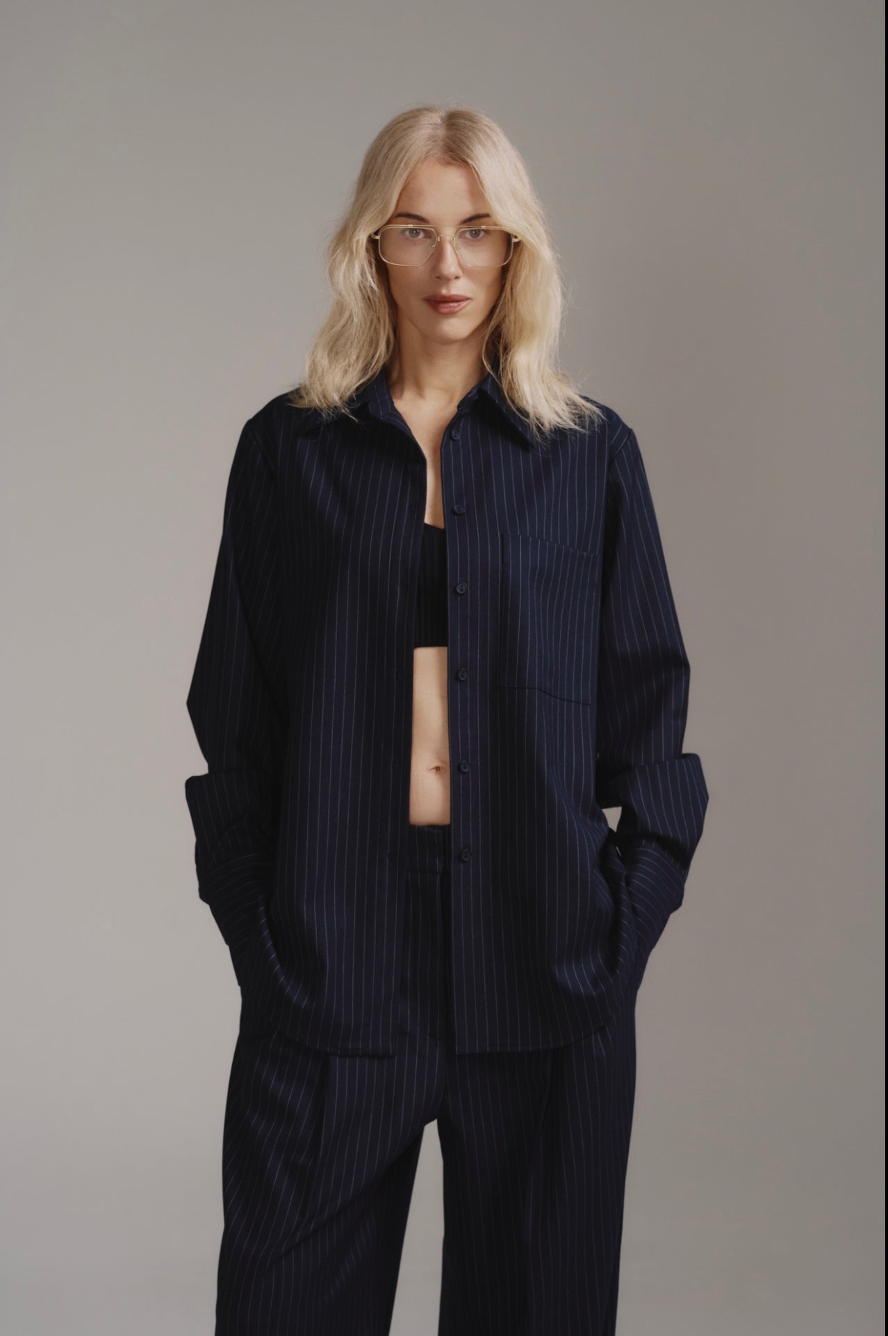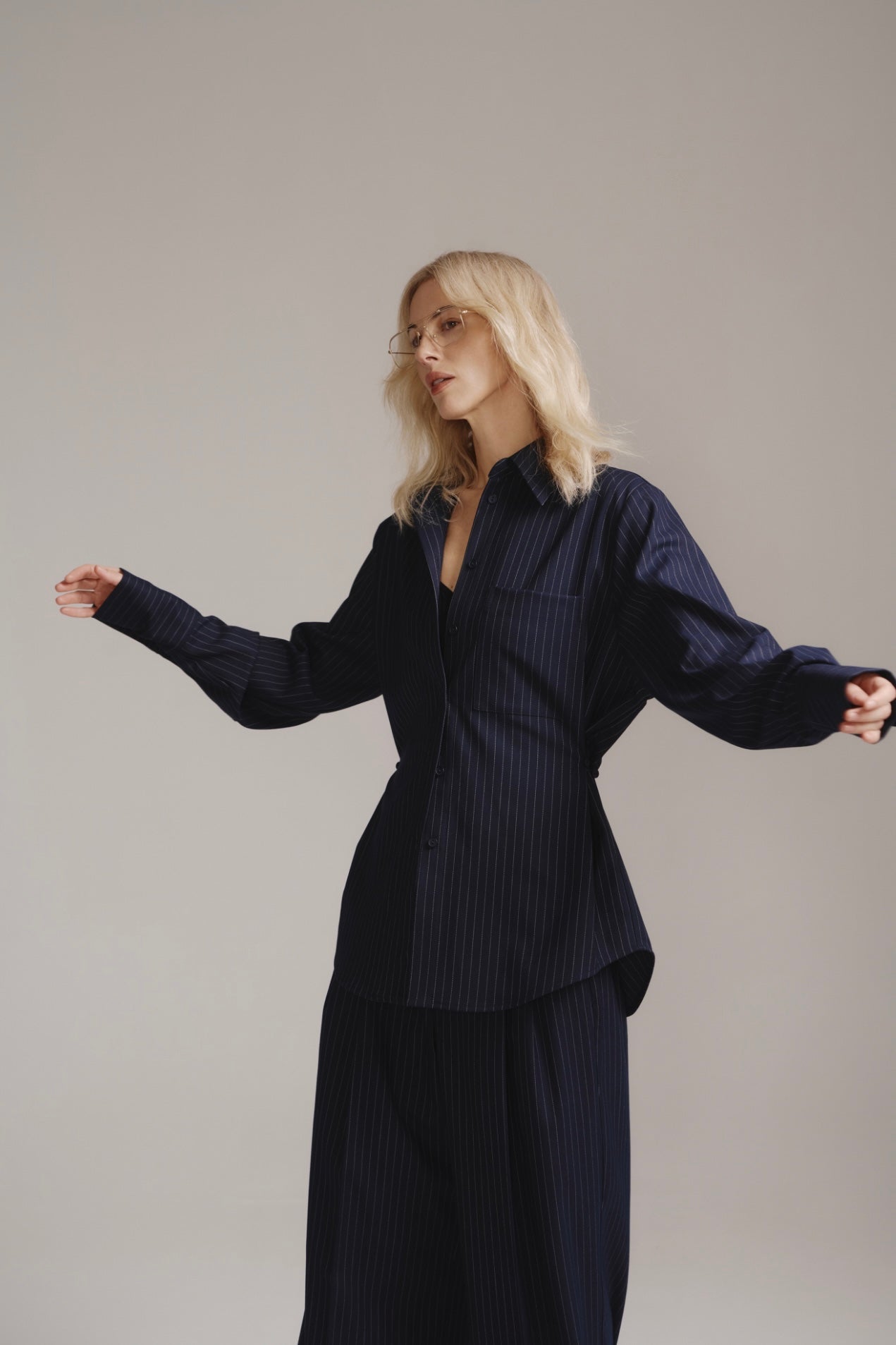 Він народився з ідеї зробити костюм, який не диктує форму, а підлаштовується під жінку. Не нав’язує, а лише підкреслює те, що вже є. Декоративні ґудзики сховані збоку, як маленький секрет.