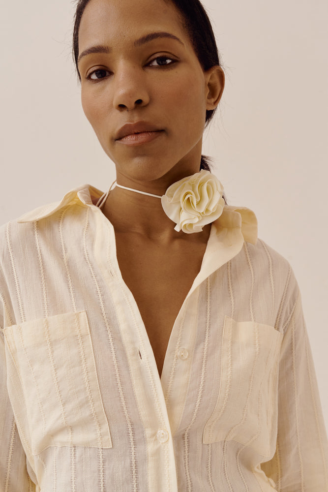 Легка сорочка зі 100% бавовни, створена з особливо м’якої напівпрозорої тканини. Делікатна смужка з тонкою вишитою лінією додає матеріалу унікальності.