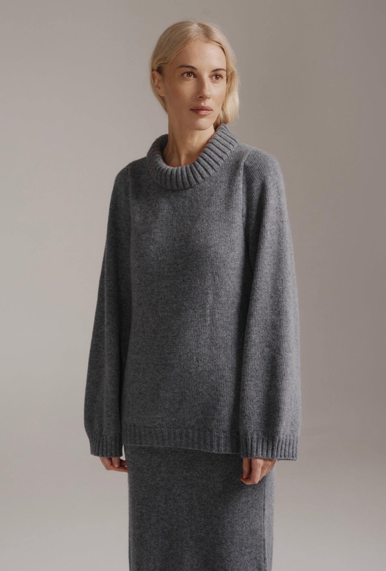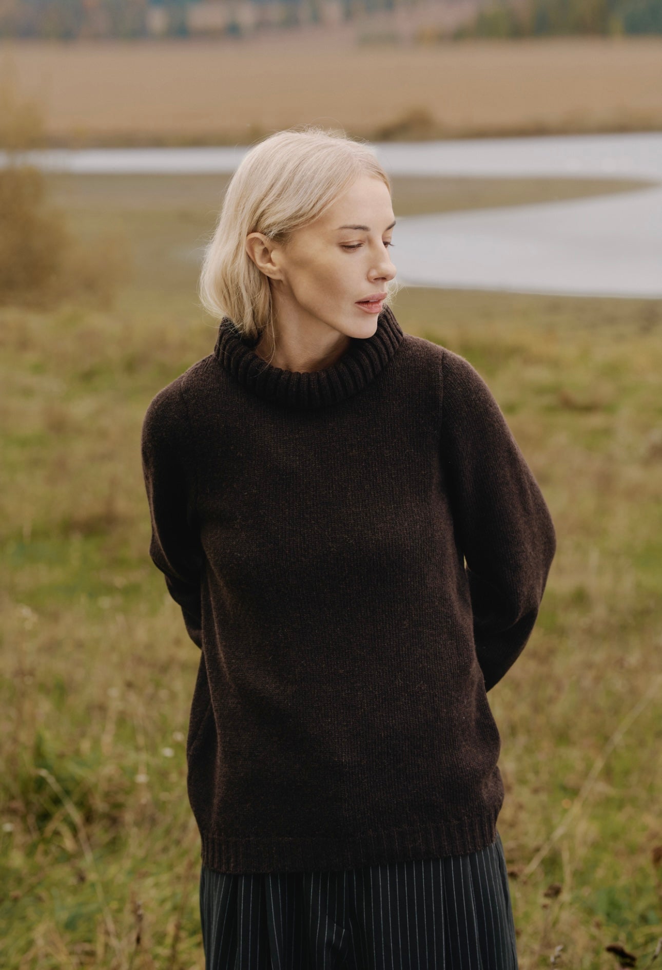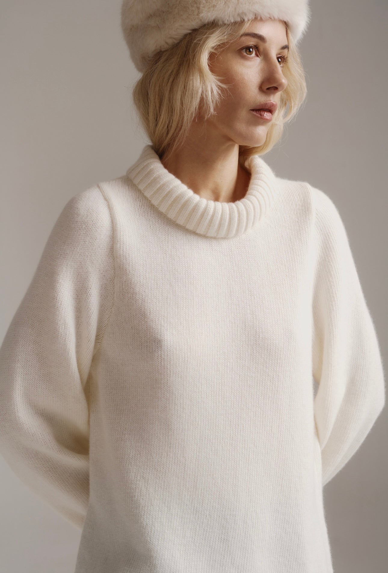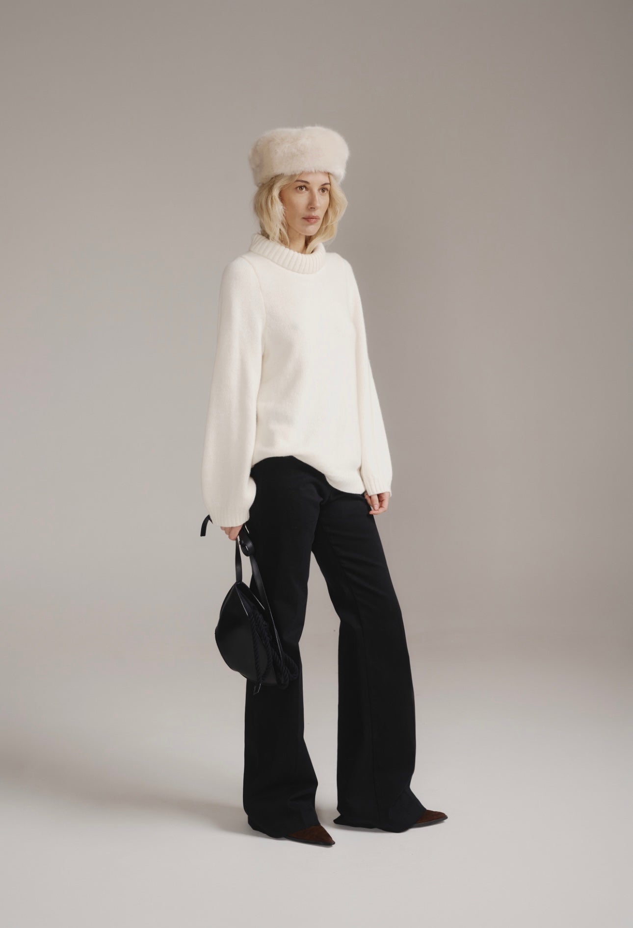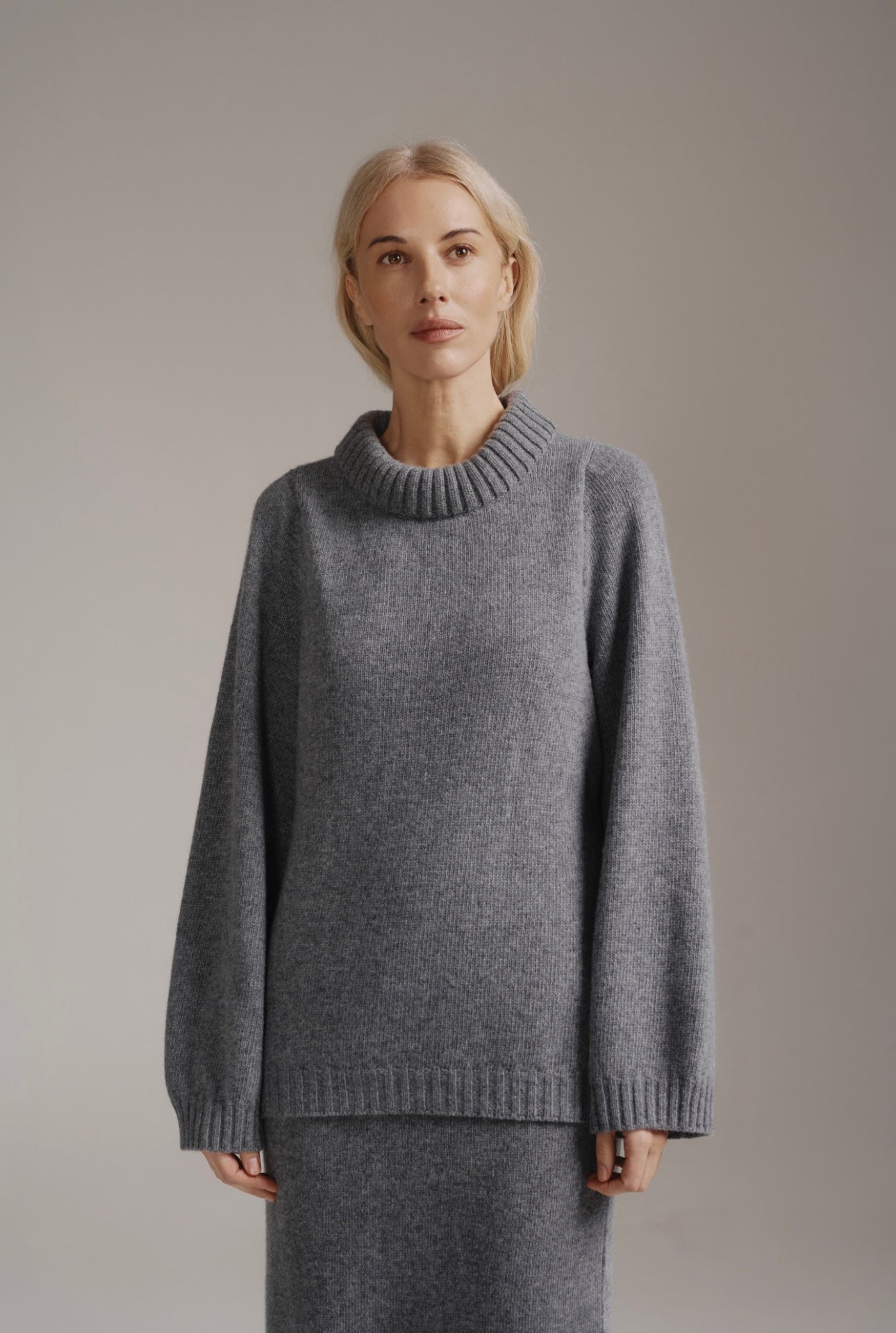 Мʼякий, як дотик, і теплий, як тиша зимового ранку. Светр з вовни ягняти, що обіймає теплом і виглядає дуже елегантно. Напівприлеглий силует з мʼяким розширеним рукавом та цікавою фактурною горловиною в формі намиста робить його базою, до якої хочеться повертатись щодня.